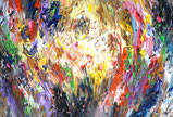 Das helle Zentrum in der Bildmitte kann an ein Tor nach oben oder zum Himmel erinnern. Das lebendige, positive Gemälde hat viele Details und ist mit einerseits warmen Farbtönen wie gelb, orange, beige, braun und magenta gemalt, andererseits bilden die kühleren Farbtöne wie grün, blau, lila, schwarz und weiß dazu einen anregenden, spannungsreichen Gegensatz. - Der geneigte Betrachter mag sich gedanklich vertiefen und der Fantasie freien Lauf lassen.....